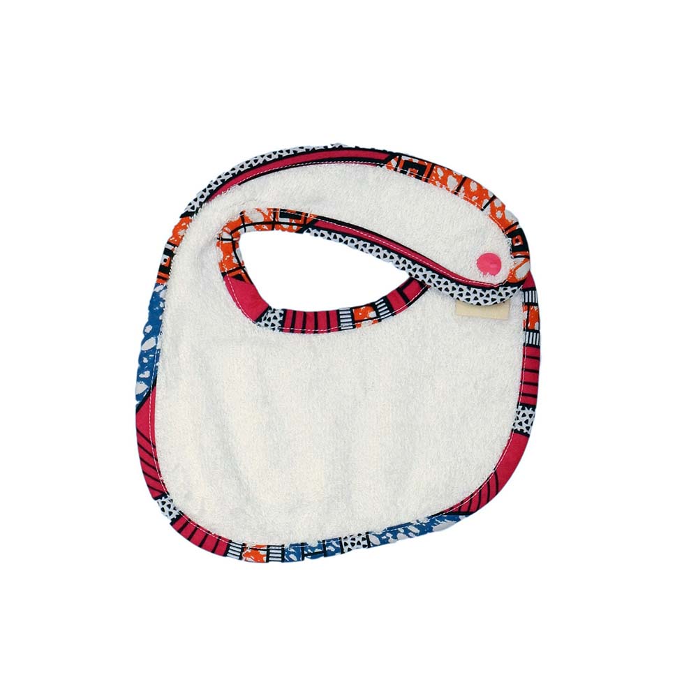 Bavoir en wax 100% éponge, coton. Motif africain unique à nouer et à pression ajustable. Lavable en machine, il apporte de la gaieté et une touche traditionnelle aux tenues de bébé.